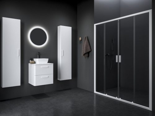 Négyrészes Blix II zuhanyajtó matt fehér kivitelben, átlátszó biztonsági üveggel és Ravak AntiCalc® vízlepergető réteggel. Tolóajtós rendszer.