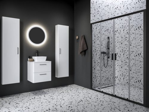 Négyrészes Blix II zuhanyajtó fekete kivitelben, átlátszó biztonsági üveggel és Ravak AntiCalc® vízlepergető réteggel. Tolóajtós rendszer.