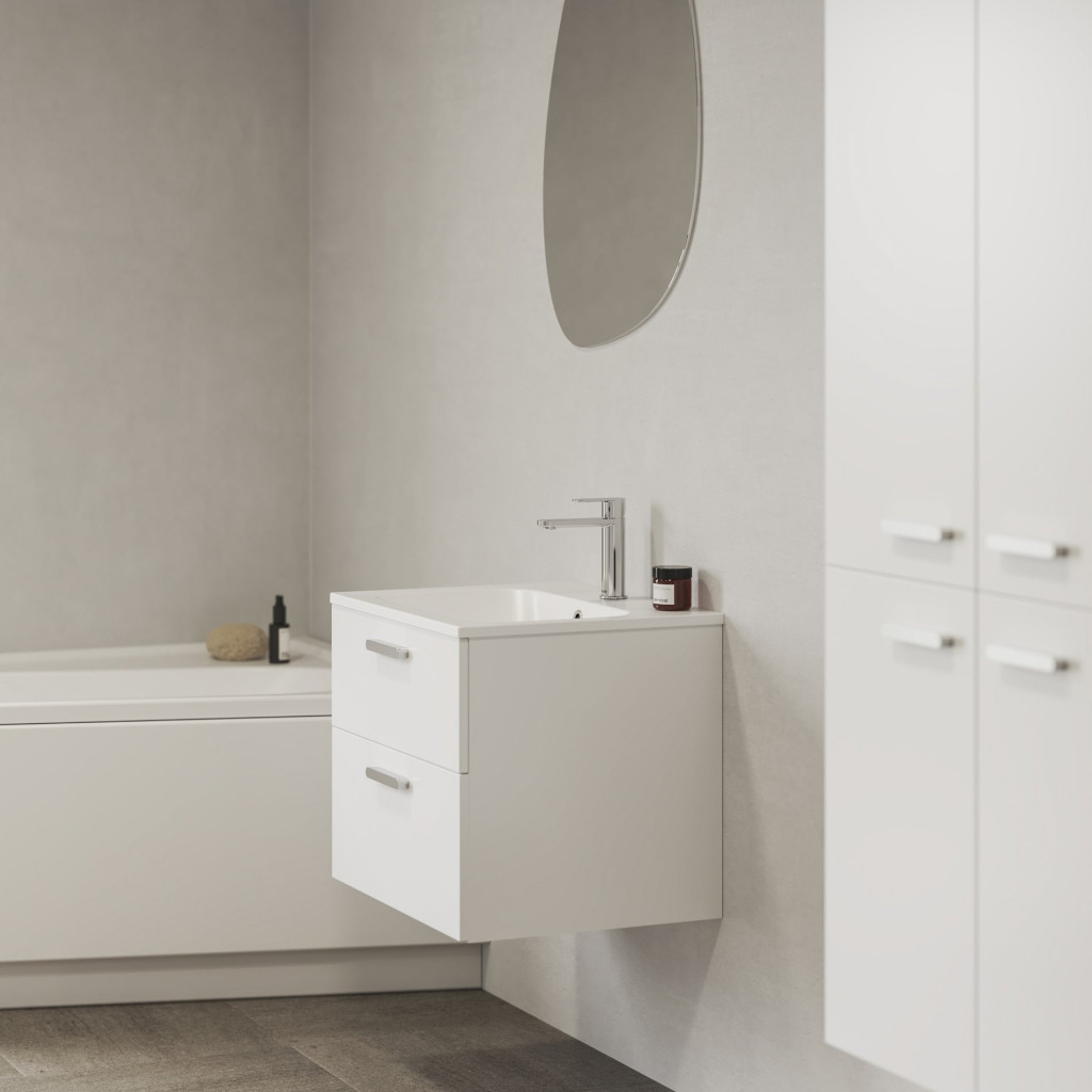 Az SD Chrome II 60 mosdó alatti szekrény két fiókos tárolóhellyel van ellátva. Az ajtót fényes fehér, a fogantyúval a választott színárnyalatban, összeszerelt állapotban szállítjuk. A szerelőkészlet (csavarok, zsanérok) a bútorlap részét képezik. A design harmonizálása érdekében javasoljuk a Chrome koncepció további elemeivel vagy más Ravak termékekkel kombinálni.