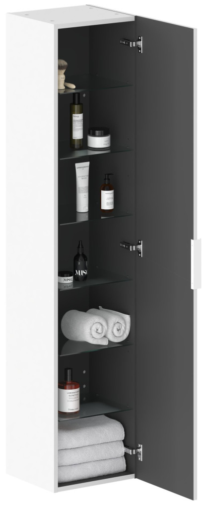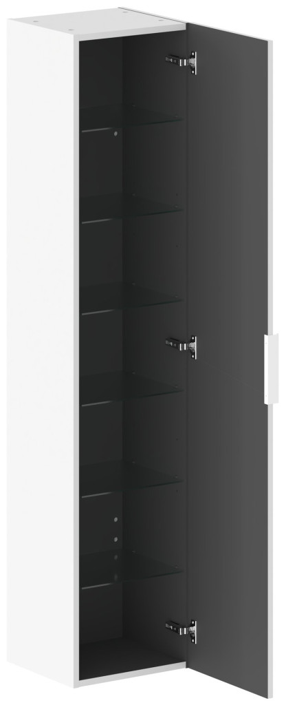 SB Comfort II 35 magas szekrény hat füstös üvegpolccal. A szekrény belső tere grafit színű. A szekrényben van egy előre fúrt lyuk a fogantyúhoz, amely nem része a magas szekrénynek, és külön meg kell vásárolni. Három színben kapható: fényes króm, fekete vagy fehér.Összeszerelt állapotban szállítjuk, szerelési készlettel (csavarok, zsanérok, dugók). A szekrényt a falra szereljük.A fürdőszoba egységes megoldásához és design összhangjához javasoljuk, hogy kombinálja a SB Comfort II 35 szekrényt a Comfort II sorozat többi bútorával és a Ravak többi termékével.
