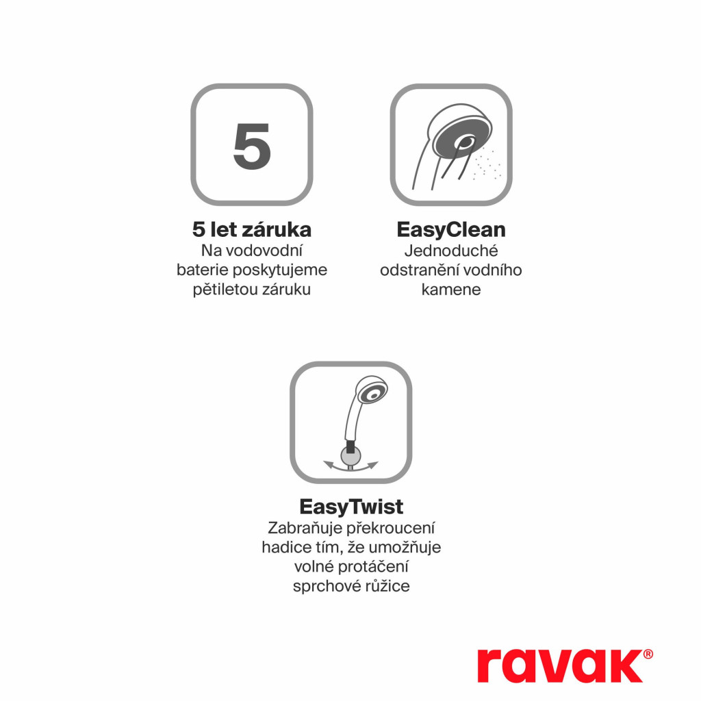 A zuhanyoszlop a mellékelt tömlővel egyszerűen csatlakoztatható a meglévő zuhany- vagy kádcsaphoz. A zuhanykabin falára szerelhető. A kapcsolóval választhat a kézi vagy a fejzuhany között.A külső tisztításhoz a Ravak Cleaner Chrome tisztítószert ajánljuk.