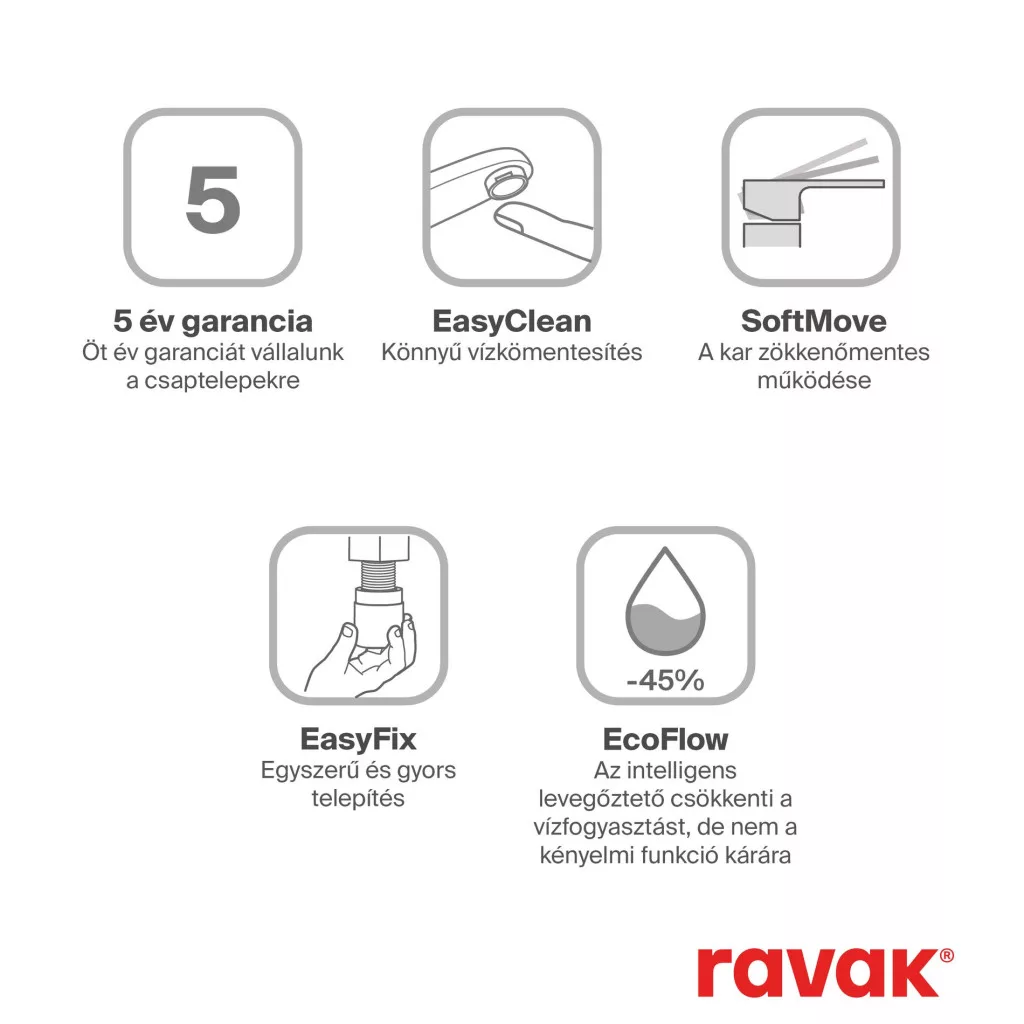 A csaptelep belsejében található egy EcoFlow funkciójú okos perlator. A vízáramlás 5 liter/percre korlátozott és levegővel dúsított. Valószínűleg észre sem veszi, de a vízfogyasztásán látszani fog, amely alacsonyabb lesz, mint a hagyományos csaptelepeké.A csaptelep BeCool funkcióval rendelkezik, amely csökkenti a melegvíz-fogyasztást. A csaptelep karja nem jobbra, hanem középen kezdődik, ahonnan kizárólag hideg víz folyik. Középhelyzetben a víz feleslegesen nem keveredik, mint a hagyományos mosdókagyló csaptelepeknél, hanem a meleg víz csak a kar balra fordításával indul el.A fürdőszoba egységes megoldásához és design összhangjához javasoljuk, hogy kombinálja az Espirit csaptelepekkel azonos színkivitelben. A külső tisztításhoz javasoljuk a Ravak Cleaner Chrome tisztítószert.
