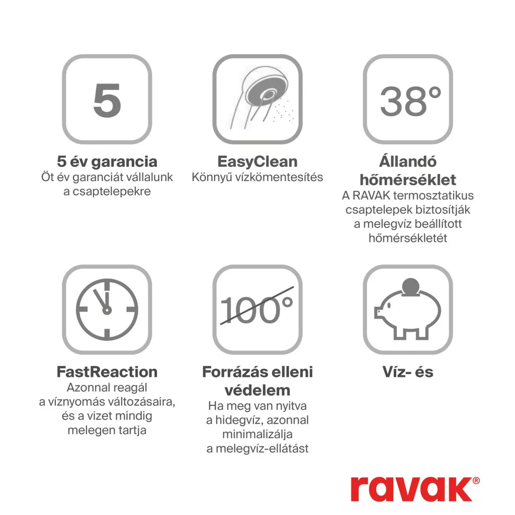 A csaptelep belsejében egy EcoFlow funkciójú perlátor található. A vízáramlás 5 liter/percre korlátozott és levegővel dúsított. Valószínűleg észre sem veszi, de a vízfogyasztásán látszani fog, amely alacsonyabb lesz, mint a hagyományos csaptelepek esetében.Egységes megoldás és a fürdőszoba designjának összhangja érdekében javasoljuk, hogy kombinálja más Espirit csaptelepekkel azonos színkivitelben. A külső tisztításhoz javasoljuk a Ravak Cleaner Chrome tisztítószert.Az RB 07B.50 alaptest nem a csaptelep része, meg kell vásárolni. Az R-box tartalmazza a falra szereléshez szükséges anyagot, de nem tartalmaz csatlakozókat a vízvezetékhez vagy más vízvezeték-szerelési anyagot. Az R-box tartalmazza a csaptelep belső testének műanyag fedelét, amely az R-boxban található, és még a csaptelep felső részének leszerelésekor is teljesen működőképesen tartja a vízellátást a fürdőszobában. Ezen műanyag részen keresztül a vízellátást szellőztetni lehet, vízszünet nélkül.