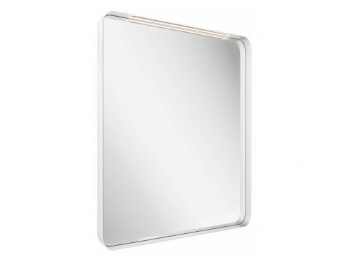 Téglalap alakú tükör vékony kerettel, fehér színben. LED világítással felszerelt.