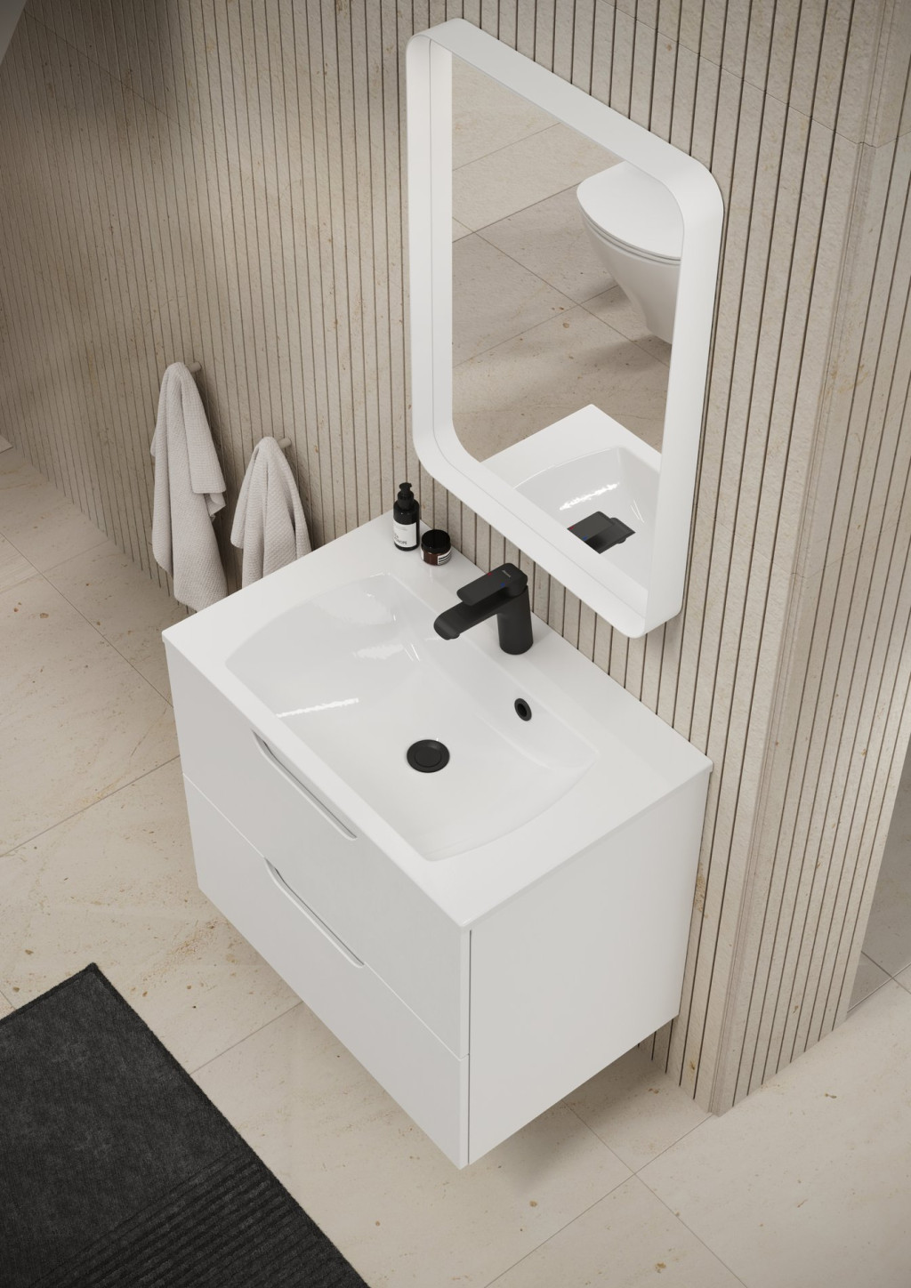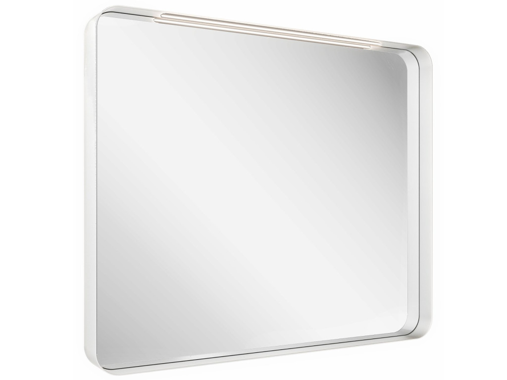 Téglalap alakú tükör vékony kerettel, fehér színben. LED világítással felszerelt.